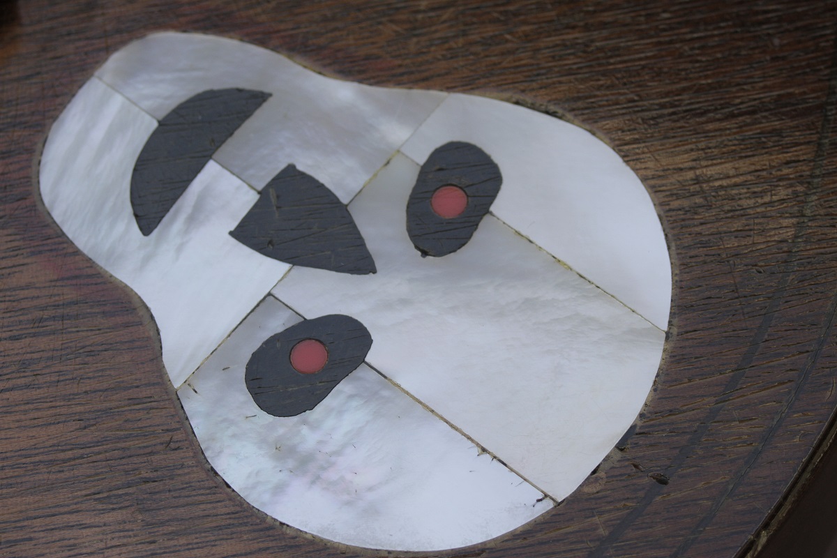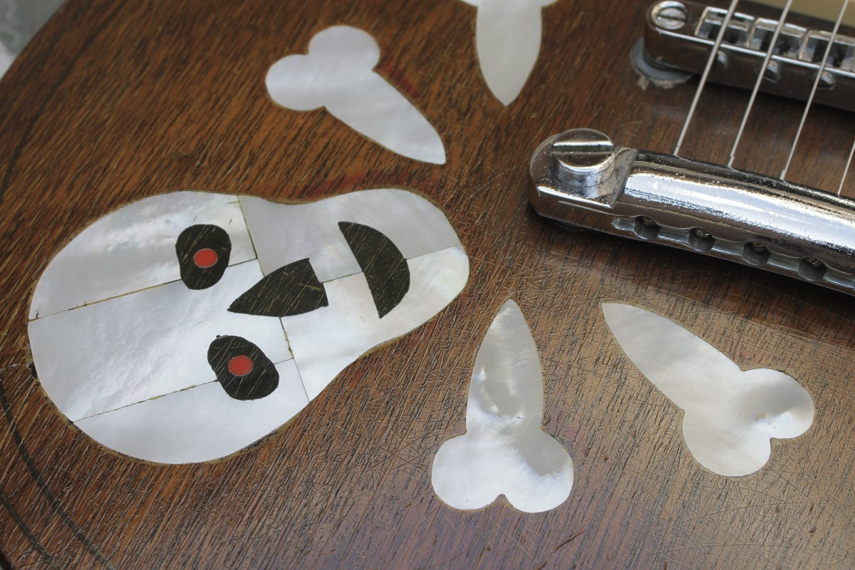 VM: この髑髏インレイ、ステージでみると無茶苦茶カッコいいのに、近くでクローズアップすると、お茶目です。赤い目玉が、笑っちゃいます。