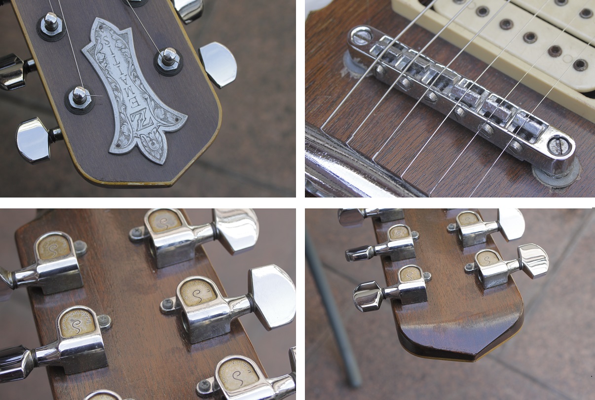 VM: 宇崎(竜童)さんの、髑髏モデルに戻りますが、ヘッドプレートがTop Gradeの槍型なのに、ブリッジとテールピースはStandard仕様の日本製ですね。