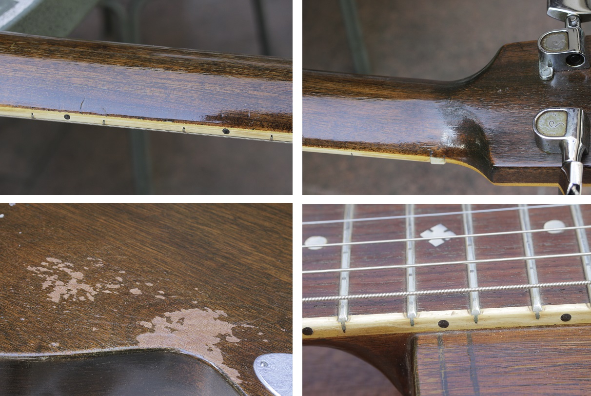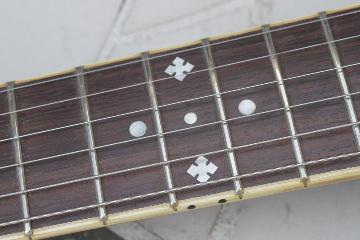 VM: ゼマイティスの特徴と言えば、この「バインディングを突き抜けるフレット」経年でバインディングが割れてくるので、オーナーは保管の湿度に注意してくださいバインディングに乗ったラッカーの細かなクラックも歴戦の勇士を感じさせますね。