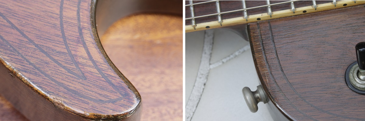 塗装が剥げた部分のマホガニーの色にも注目