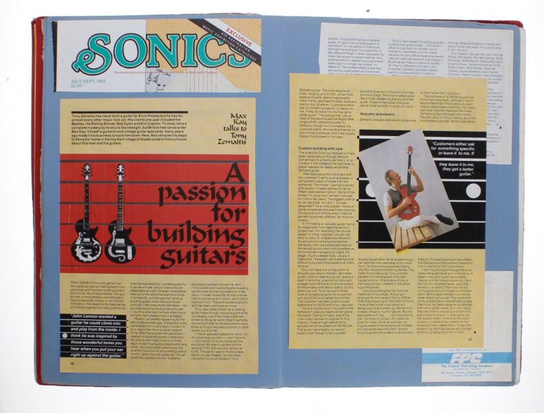ホワイト・スネイクに加入したばかりのミッキー・ムーディーが、工房で出来上がった本器をもって、ワールドツアーに参加、日本のステージでも観衆を沸かせた。リック・パーフィットや、ジェームズ・ハニーマン・スコットのドラゴン・インレイトップとおなじテンプレートから作りだされているLPを少し小ぶりにした、シングルカッタウエイ・デザインに、“つちのこ”のような、白蛇がレイアウトされ、ギブソンのヴィンテージ・ステッカード・ハンバッカー一基搭載という、ロックな仕様。ヘビのうろこ模様は、貝を掘り込んで、木目用フィラーを刷り込んだあと、ラッカーで仕上げられている。もともとは、パールホワイトであったが、エイジングによりラッカーに黄ばみがかかり、ゴールドの様相を呈している。ロッドカバーには、1982年Englandとあり、そのエングレイヴの細かさをみると、テールピースの彫金もそうだが、ダニーが、非常に細部にいたって丁寧な仕事をみせているのが興味深い。ウエイト約9ポンドも、レス・ポールの標準か。あえてガルウイングのフレイムメイプルを選んでいる点、既成のLPのイメージにとらわれないトニーらしさの表れだ。